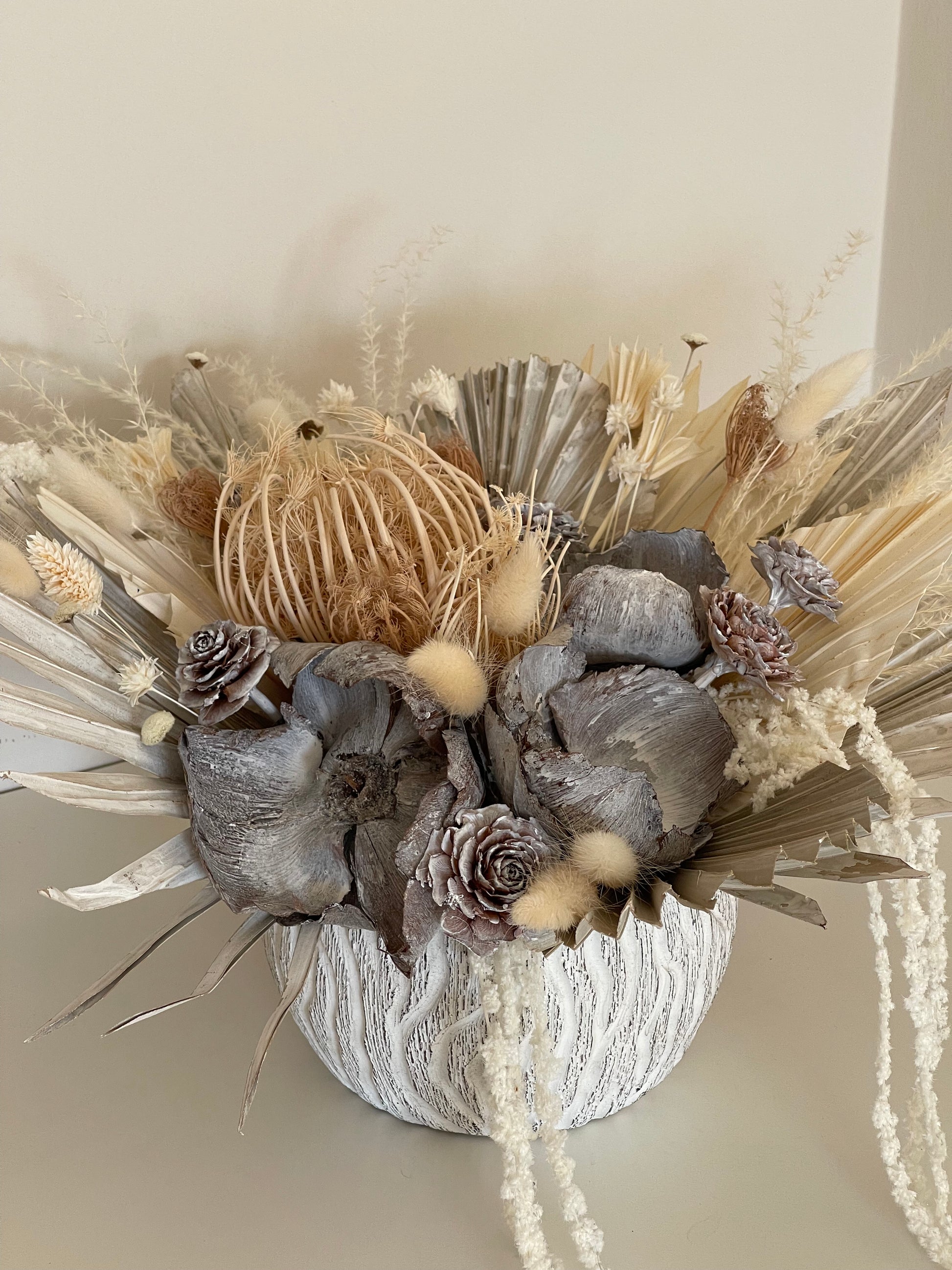 Immerse your space in timeless beauty with our delicate, hand-crafted centerpiece. Palm branches, pampas and a variety of natural wheat, this arrangement exudes organic charm in equal measure.