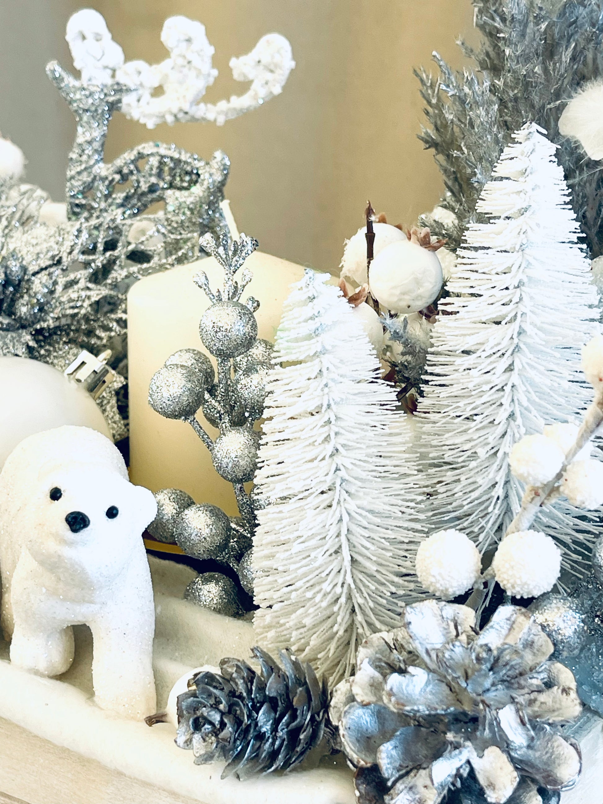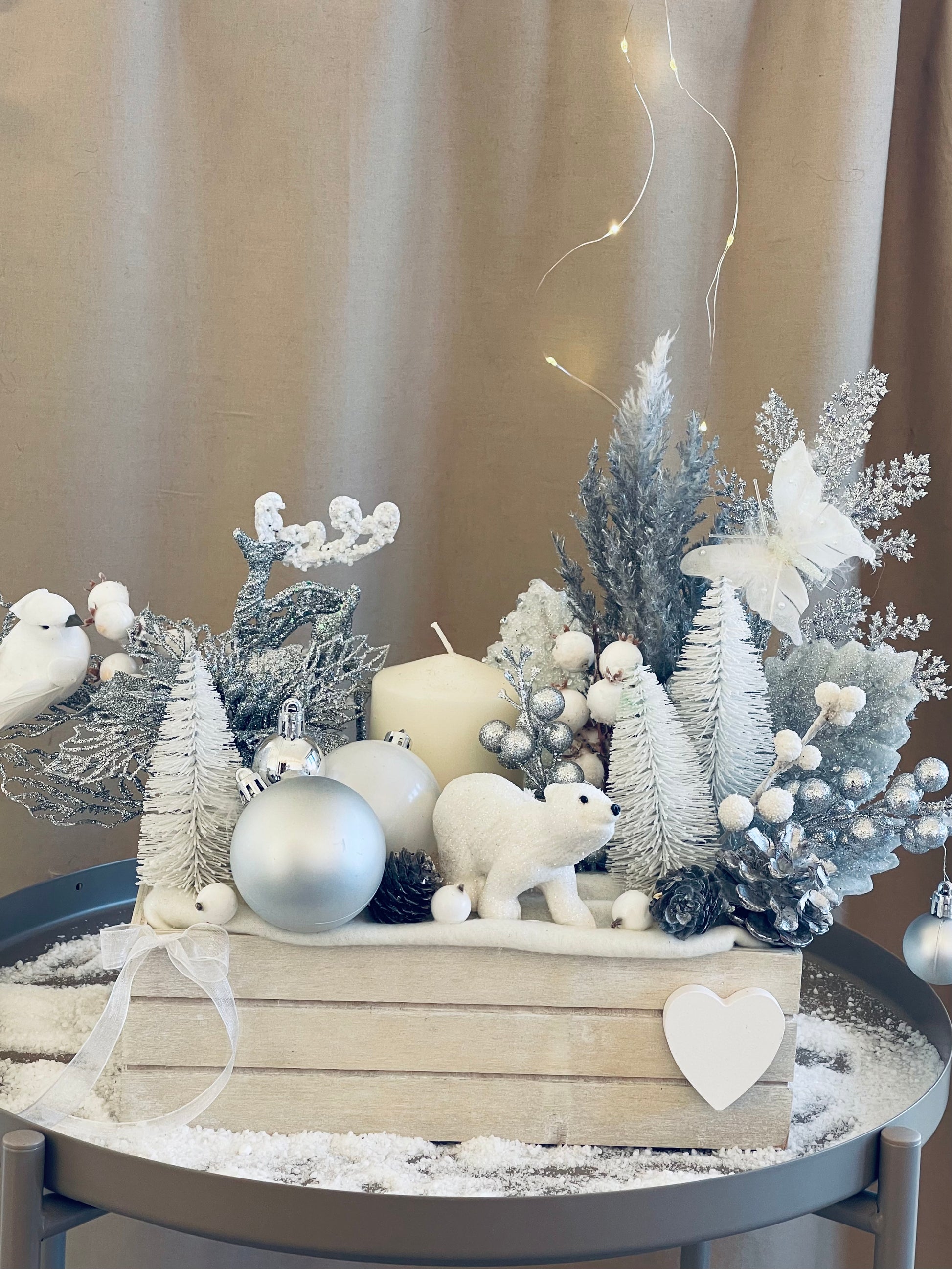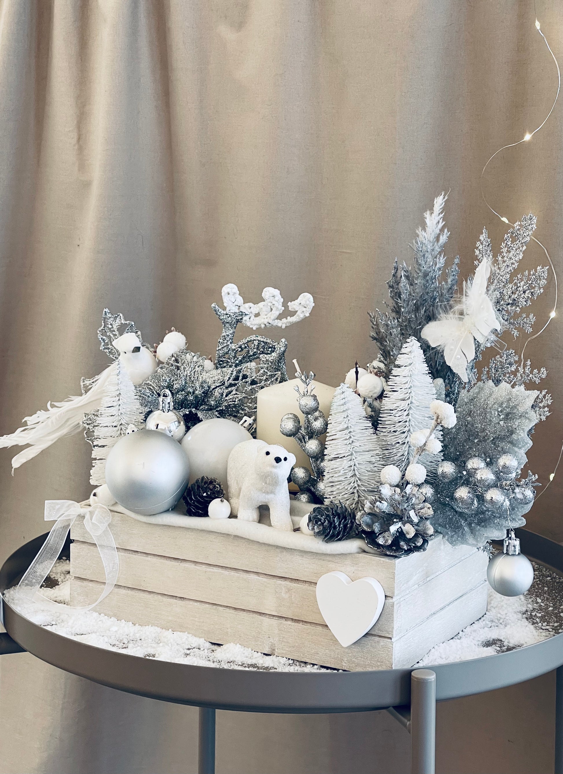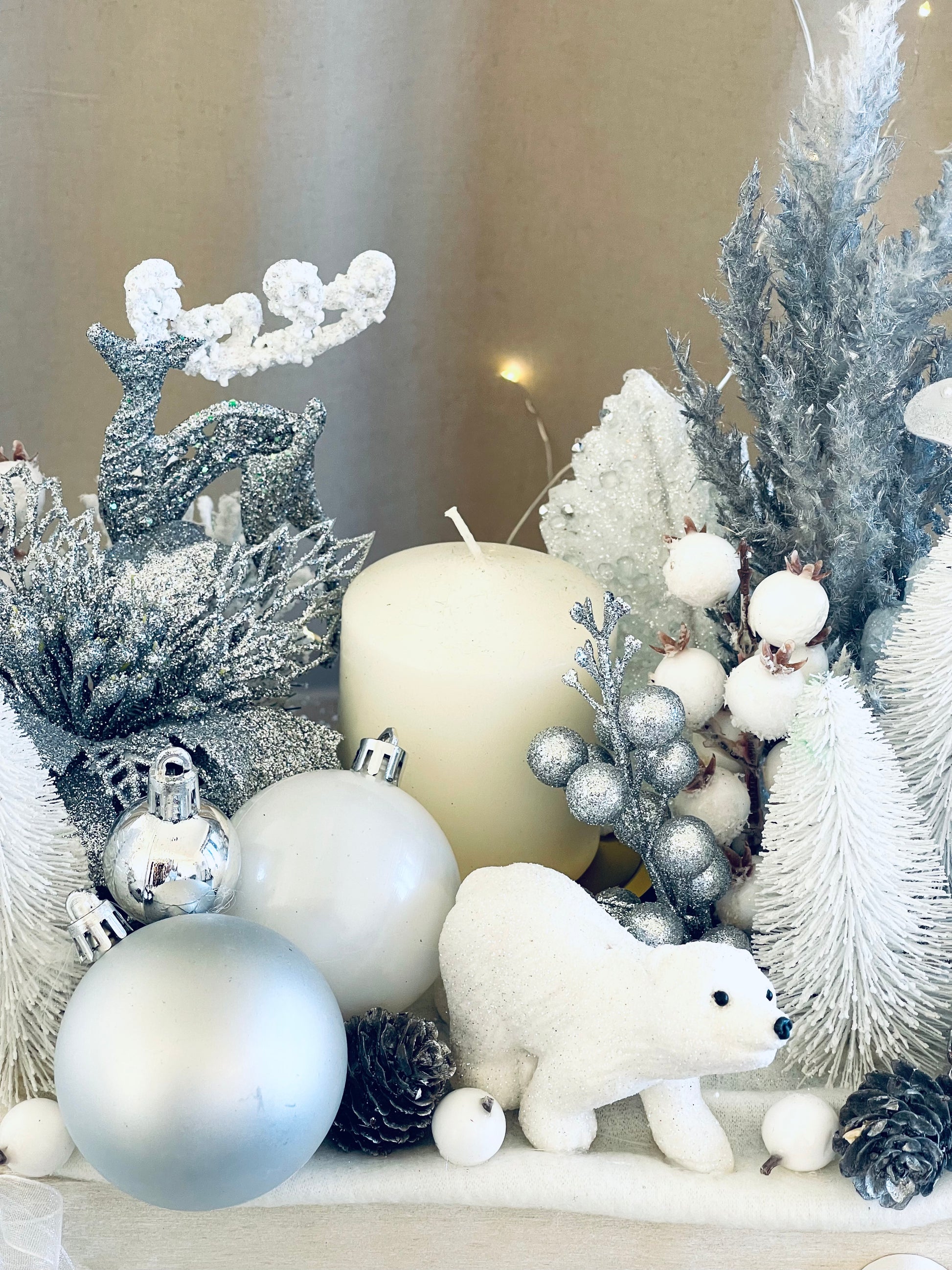 Lilly, Hand made Christmas decor in a box, with a candle, made of artificial materials, white, silver color with animal and forest motives.