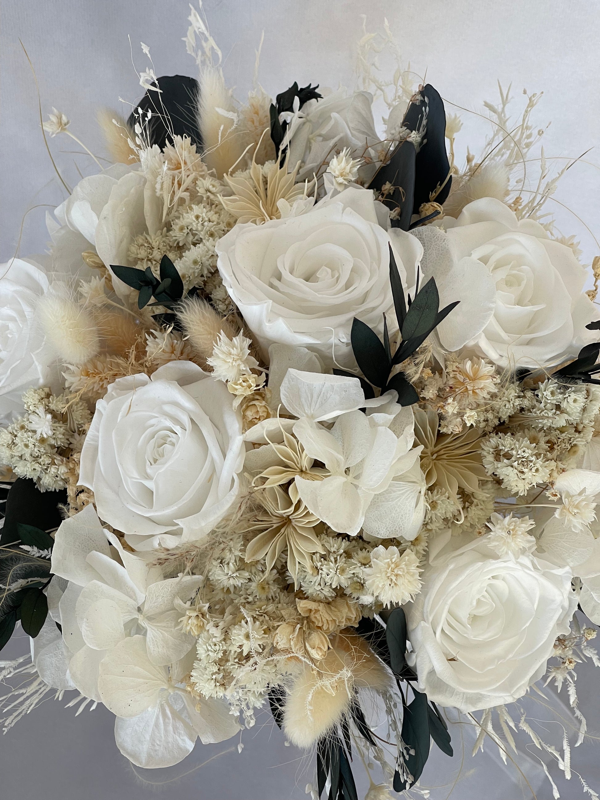 A composition of grace and sophisticationAsteria showcases white roses, accented with eucalyptus for a delicate yet striking aesthetic. Carefully preserved for lasting beauty, this unique arrangement adds an element of natural charm and elegance to any setting.