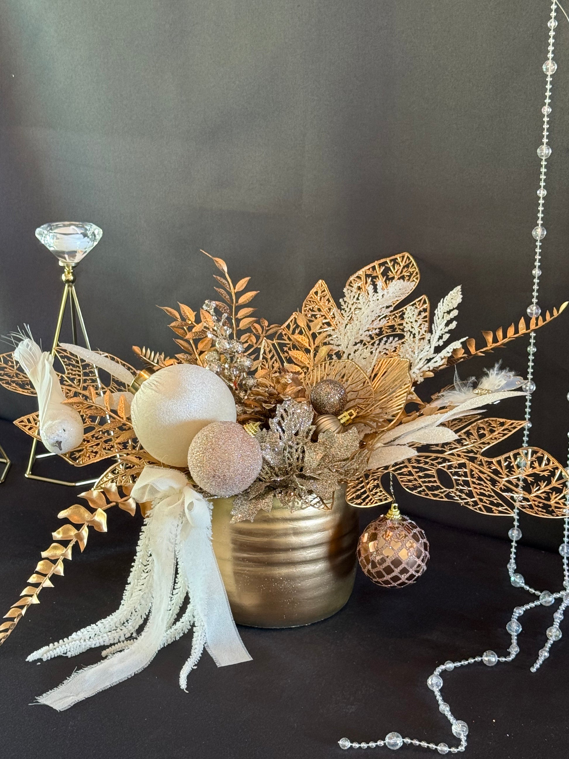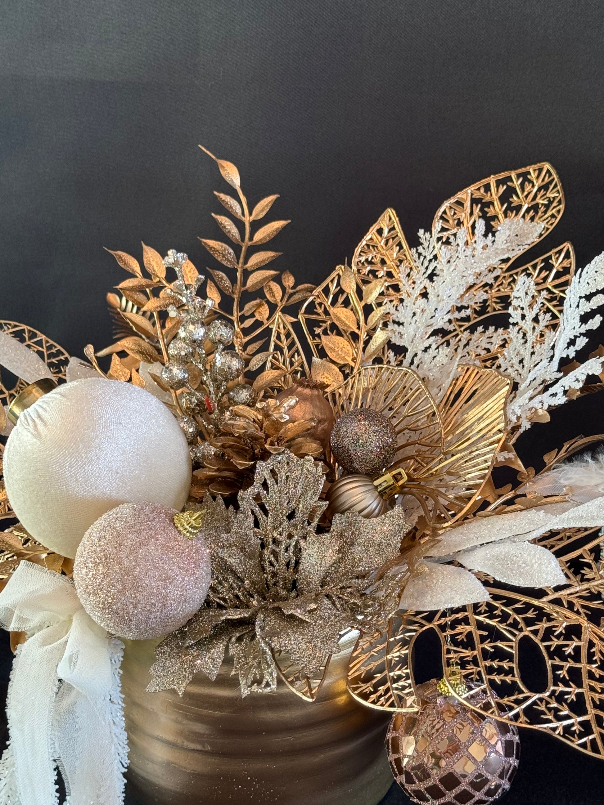 Urmia, Christmas table decoration. Christmas decor in a ceramic pot with faux gold branches and leaves, a beautiful Christmas decoration. The arrangement is done in gold, soft pink, and white. Bring Christmas feeling into any house. Gorgeous and versitile will serve for many years. Ideal for home, office decoration. Perfect gift idea for anyone!